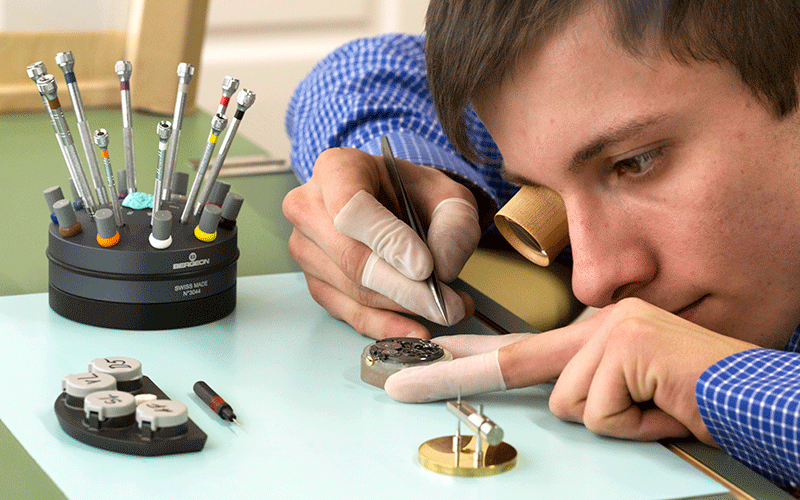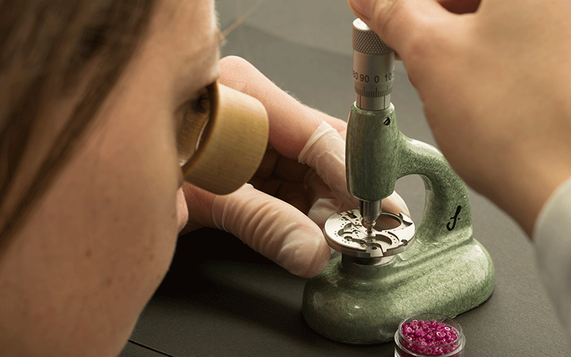 Nachdem die filigranen Teile in der Finishabteilung zu ästetischen Meisterwerken veredelt wurden, erfolgt schließlich die erneute Montage des Kalibers. Die Teile werden zu Montagesätzen vorsortiert und baugruppenweise montiert. Bereits während der Endmontage werden Ganggenauigkeit und Gangverhalten kontrolliert und reguliert.